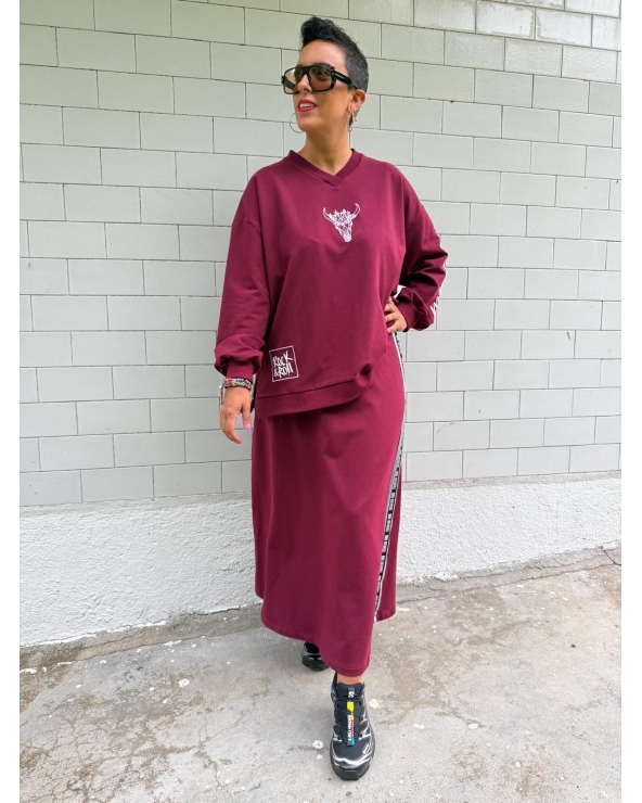 Nuevo Quick view Carro Sudadera Mad Granate 79,90 € Sudadera oversized granate, aberturas laterales, cuello pico y detalles bordados en blanco. ideal con la falda Mad. 94% algodón 6% elastán