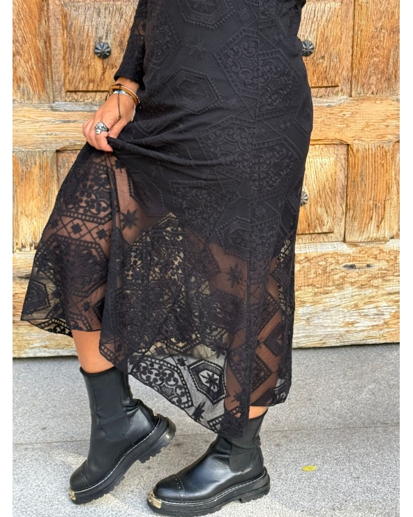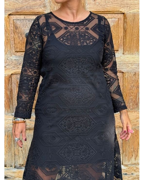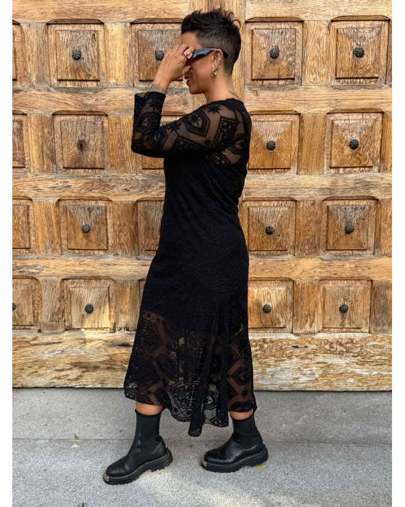 Vestido encaje manga larga, corte en A, con piezas a los lados para dar más movimiento, muy favorecedor.